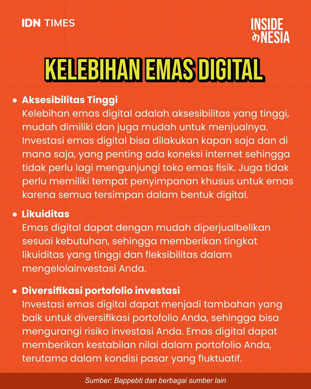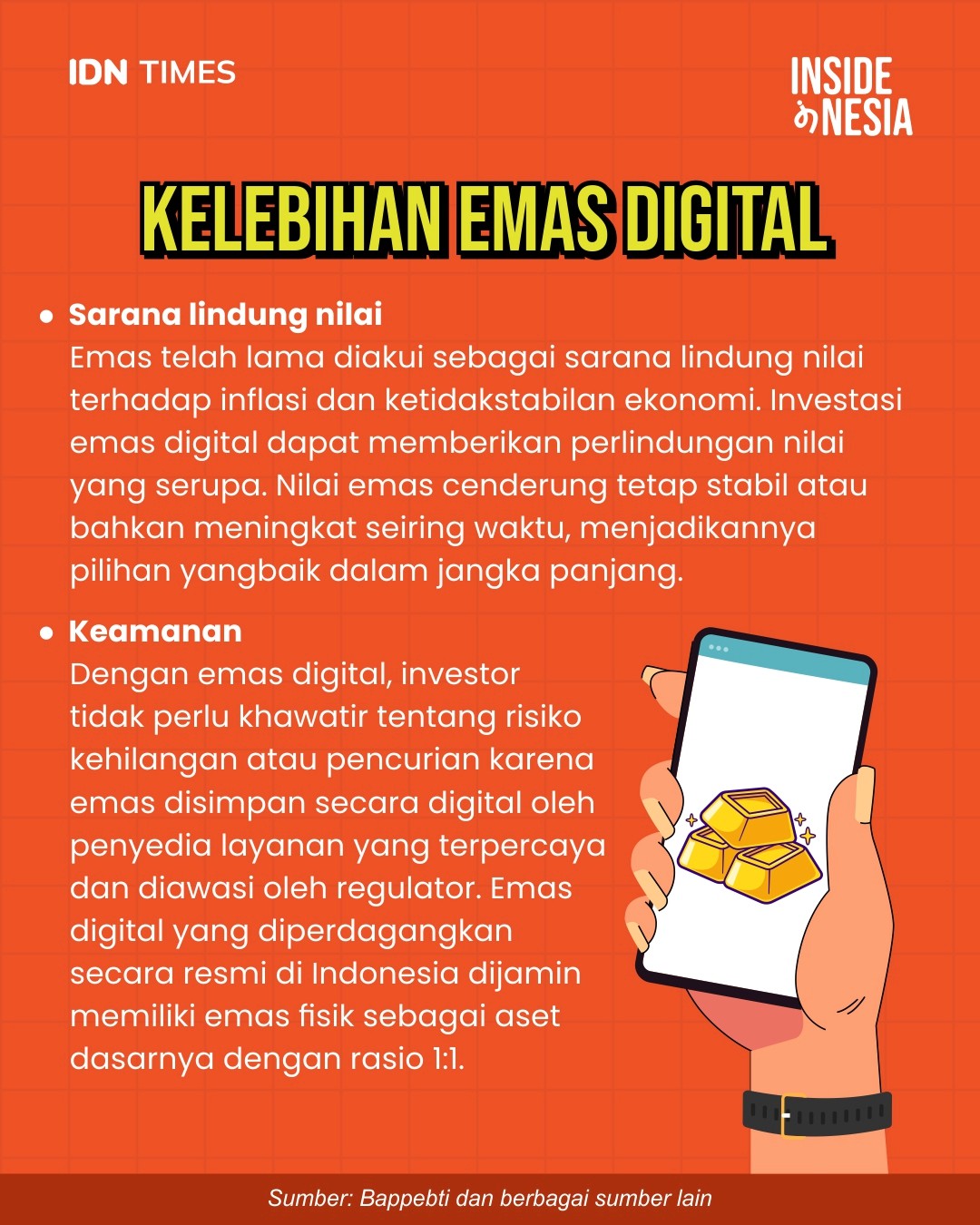 Selain karena emas masih diyakini jadi investasi paling aman atau safe haven, emas juga lebih mudah untuk diperjual belikan. Apalagi saat ini, investasi emas makin berkembang. Masyarakat tak perlu repot membeli emas fisik, mengikuti zaman dan teknologi, menabung dan membeli emas sudah bisa dilakukan secara digital melalui berbagai platform maupun perusahaan milik negara.