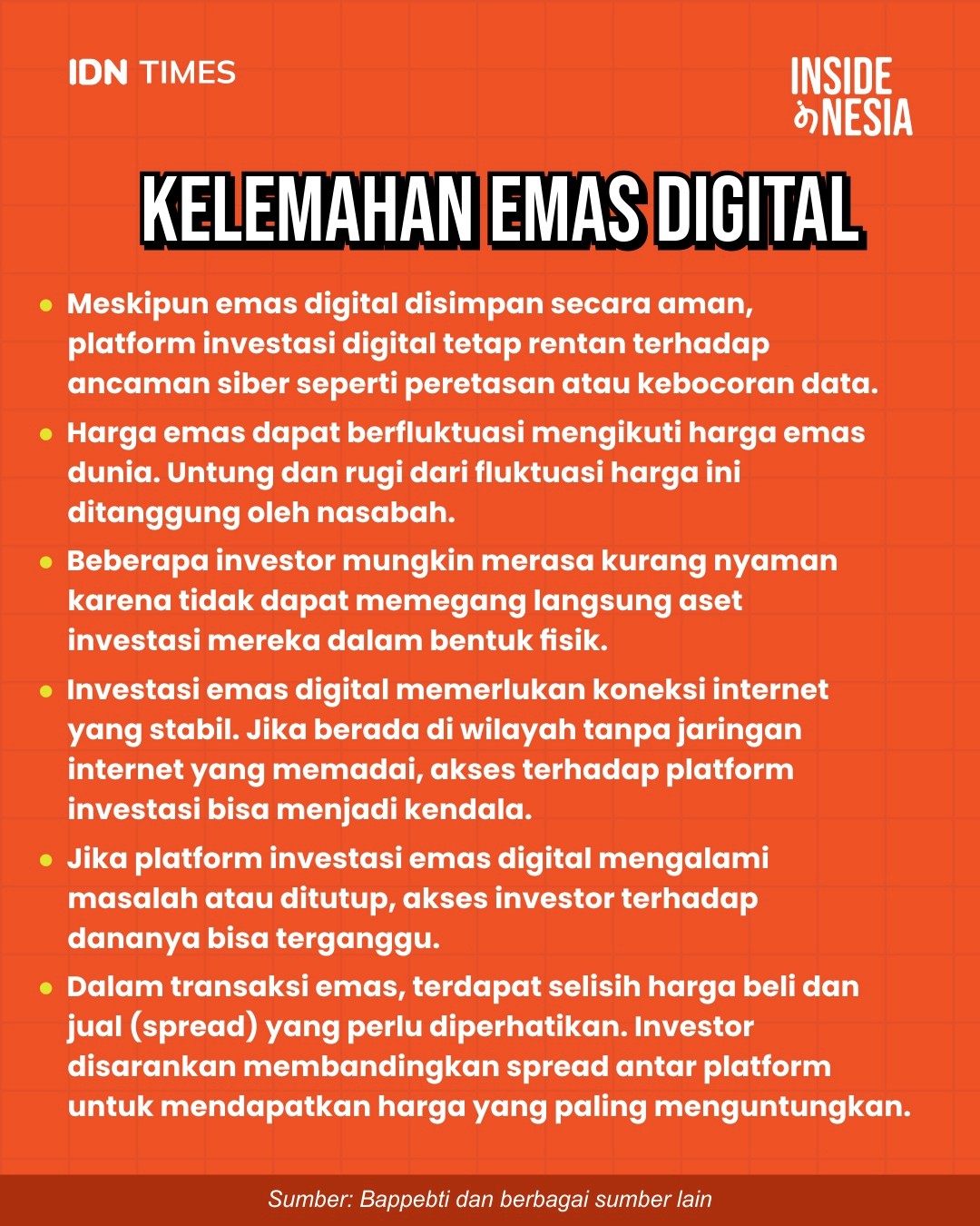 “Masyarakat yang membeli emas secara digital memang tidak langsung mendapatkan emasnya secara fisik, namun dapat mengajukan permintaan penarikan emas fisik kepada masing-masing pedagang,” ucap dia.