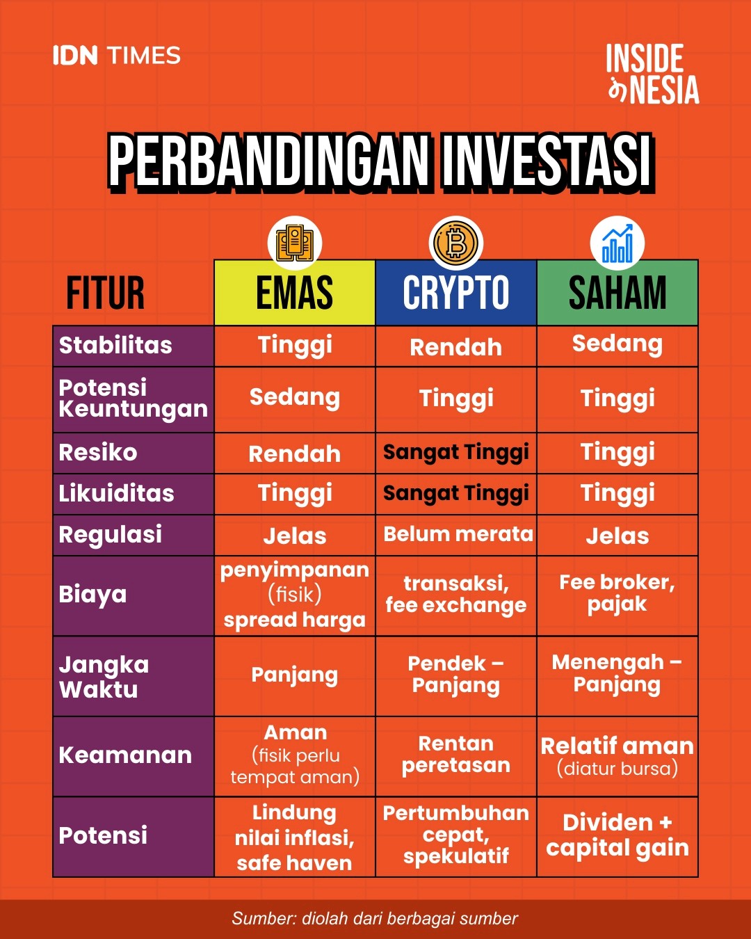 “Untuk jangka pendek atau menengah, jangan pilih emas. Kemudian harus pakai uang dingin. Uang yang benar-benar tidak akan dipakai dalam waktu dekat. Jadi harus tahu goals dulu, baru menentukan strategi—nabung rutin atau beli bertahap,” katanya.