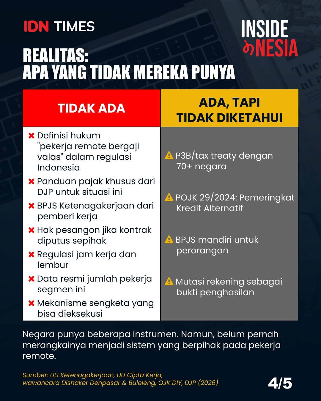 Penjelasannya menggambarkan betapa bahkan pertanyaan teknis paling dasar pun belum memiliki jawaban standar yang bisa digunakan pekerja remote sebagai panduan. Berdasarkan pengalamannya sendiri menerima kontrak dari luar negeri, Yudis menyebut bahwa tidak ada kewajiban melaporkan ke pihak mana pun di Indonesia. Hal ini secara tidak langsung membiarkan pekerja bertindak berdasarkan asumsi masing-masing.