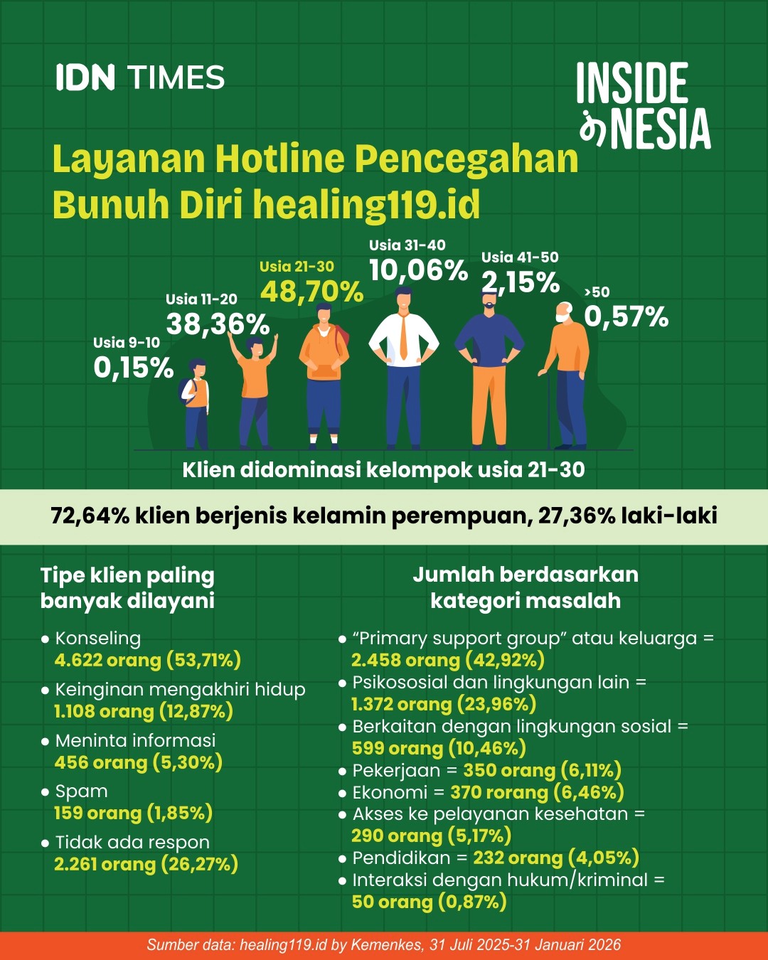 Di tengah keterbatasan layanan tatap muka, negara mulai membuka jalur lain, meski masih jauh dari cukup. Salah satunya melalui layanan hotline pencegahan bunuh diri healing119.id. Layanan ini diinisiasi oleh Kementerian Kesehatan dengan melibatkan relawan psikolog klinis anggota Ikatan Psikologi Klinis Indonesia.