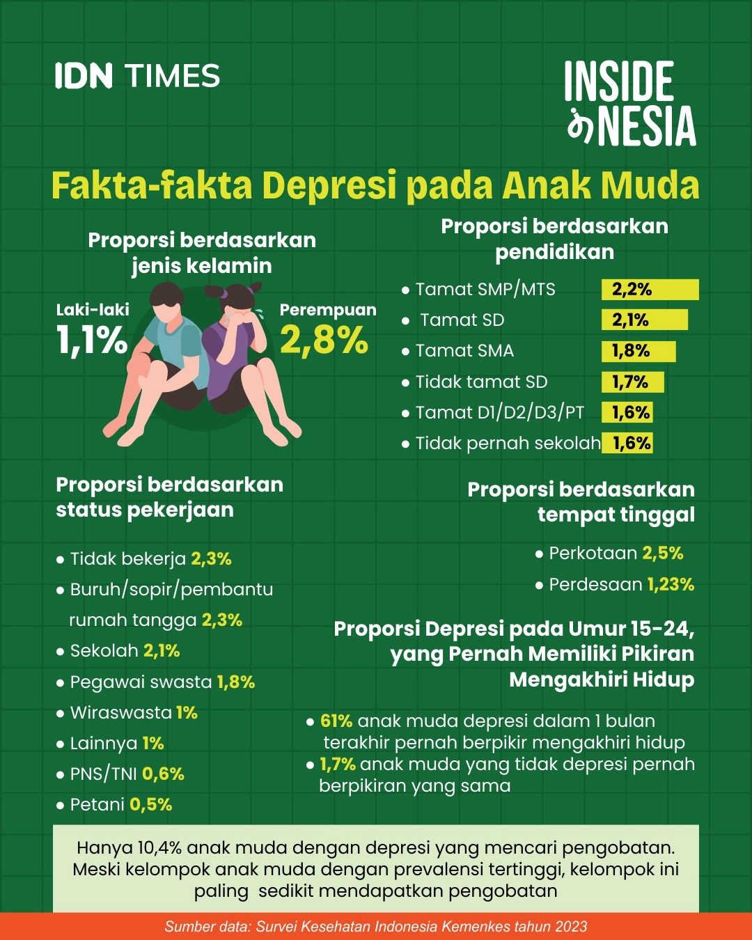 Dari seluruh penduduk yang terdiagnosis depresi, hanya 10,1% yang mendapatkan akses pengobatan medis, baik melalui obat-obatan maupun konseling profesional. Artinya, sembilan dari sepuluh penderita depresi di Indonesia dibiarkan berjuang sendirian.