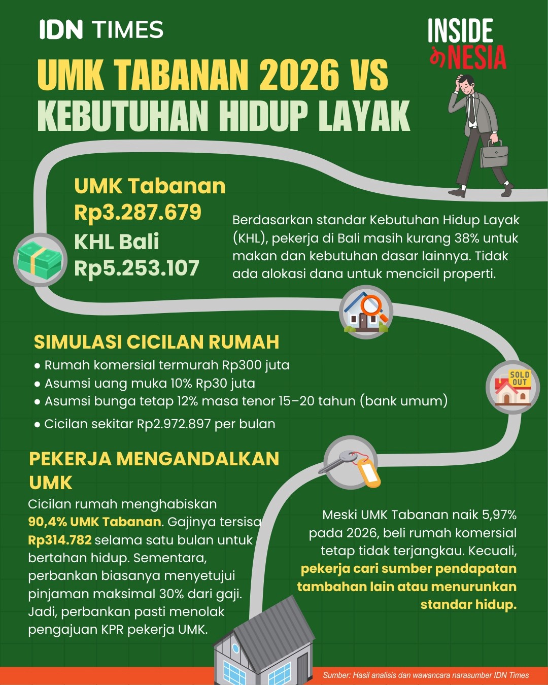 Lantas, apakah karyawan yang mengandalkan gaji UMK bisa membeli rumah komersial pada tahun 2026? Dari infografis di bawah dengan locus Tabanan, yuk kita bedah angka apakah itu logis untuk karyawan UMK.