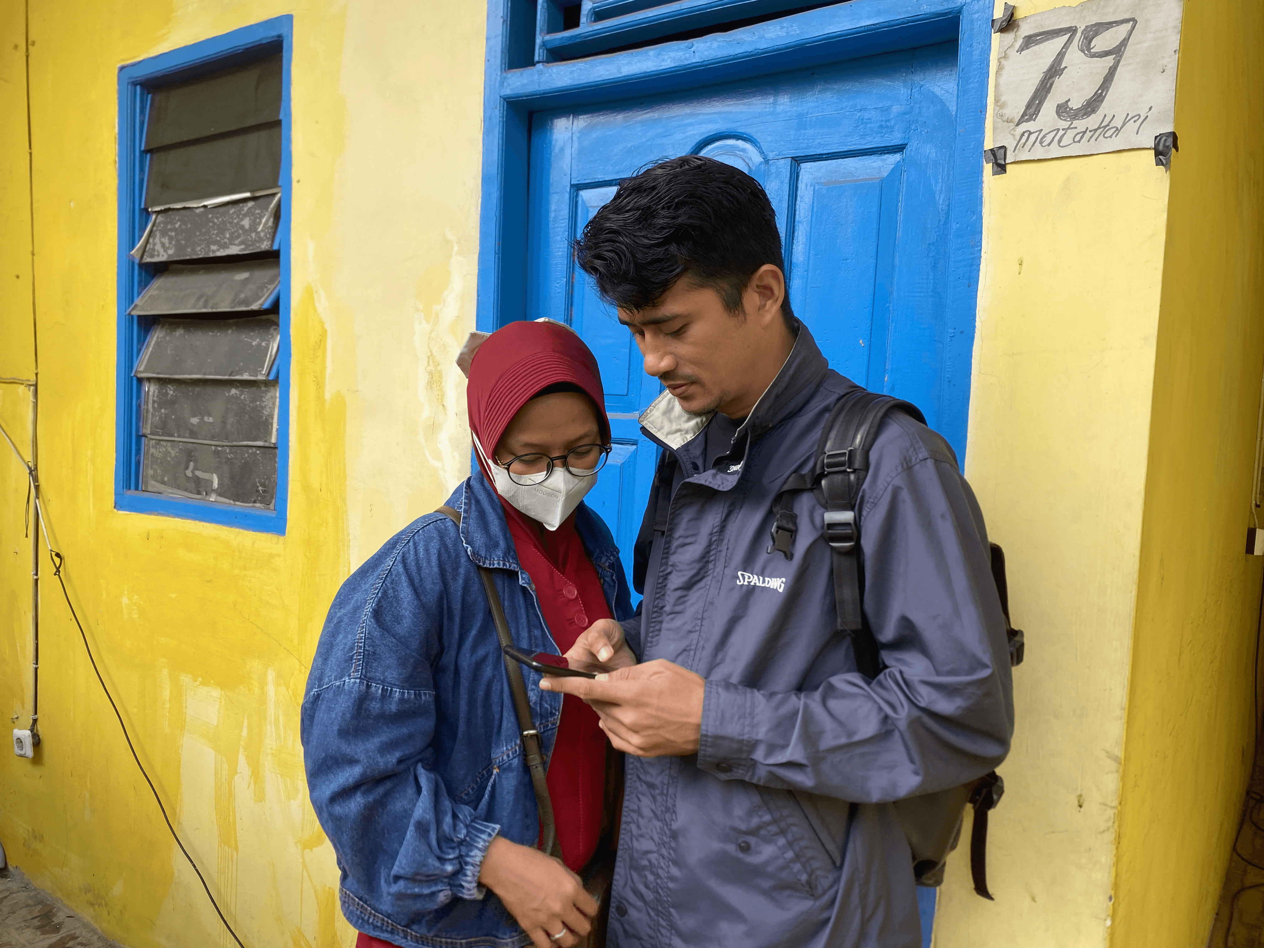 Arina dan suaminya, Tian, di depan rumah kontrakan. (IDN Times/Khusnul Hasanah)