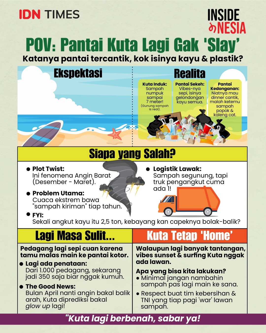 Puncak dari ironi krisis kebersihan ini justru berpusat di jantungnya: Pantai Kuta induk. Kondisinya begitu parah hingga pemerintah daerah harus mengambil langkah darurat dengan memanfaatkan area setra (kuburan) di wilayah Desa Adat Kuta sebagai titik pengumpulan sampah sementara.