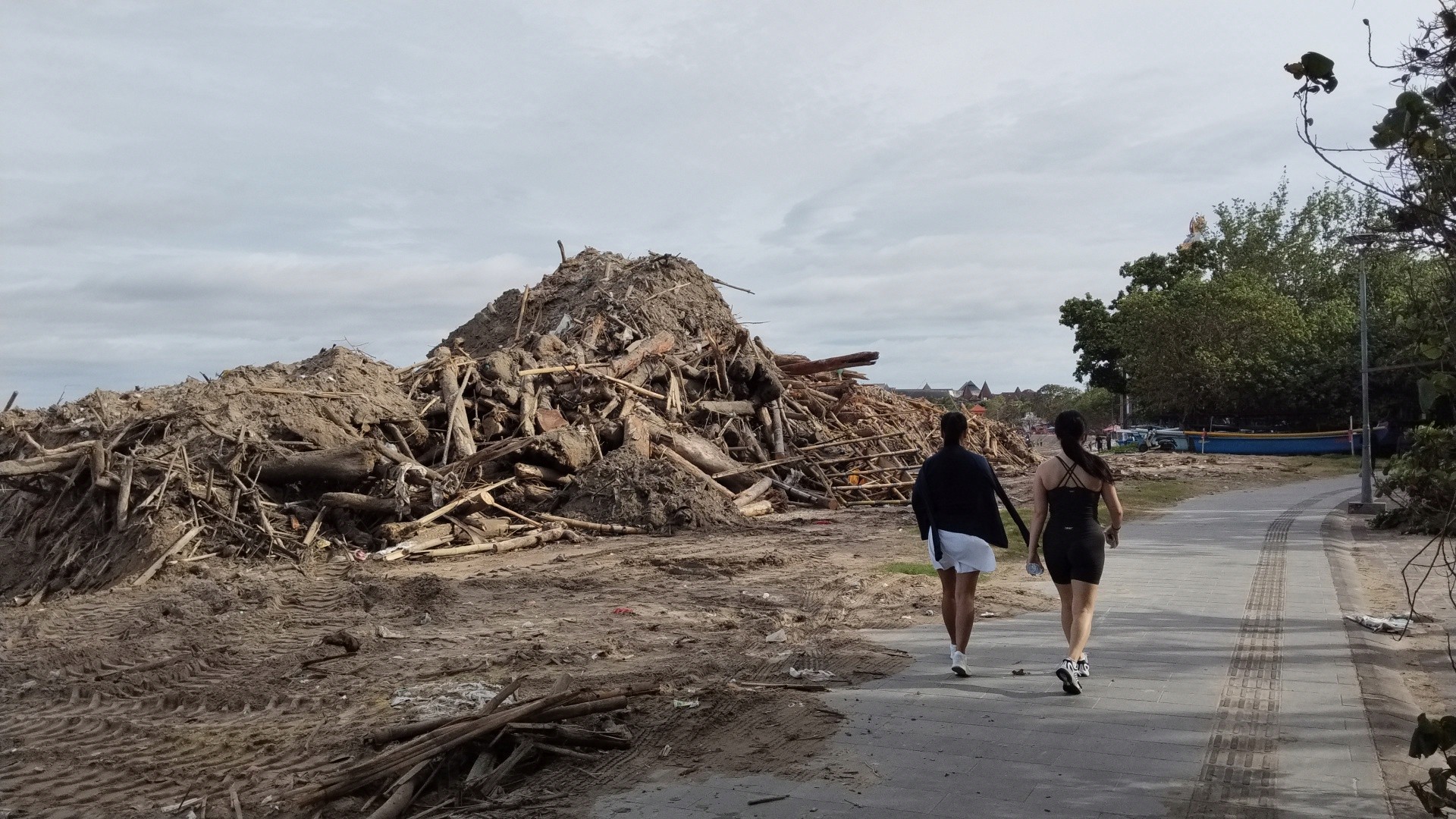 Di area ini, sebuah backhoe loader harus dikerahkan untuk memilah dan mengumpulkan gelondongan kayu berukuran raksasa, sampah plastik, dan material organik yang sudah menyatu dengan pasir pantai. Pemandangannya sungguh mencengangkan. Tumpukan sampah tersebut menjelma layaknya bukit buatan dengan ketinggian diperkirakan melebihi 7 meter. Mirisnya, "gunung" sampah yang terbentuk sejak November 2025 lalu ini belum juga tertangani tuntas hingga sekarang.