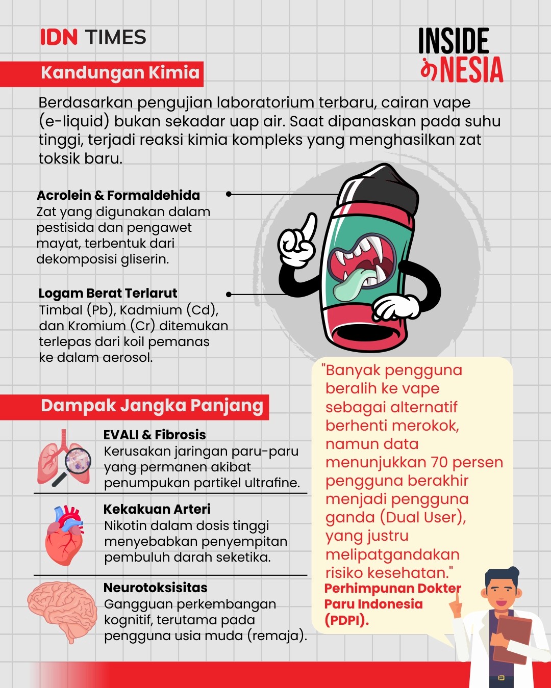 Menurutnya, dampak kesehatan dari vape bukan lagi ancaman teoritis. Sebagai klinisi, ia dan sejawatnya di Indonesia sudah menemukan kasus-kasus nyata. Risiko yang paling sering ditemui adalah peningkatan infeksi paru seperti pneumonia, iritasi yang memicu batuk kronis, hingga serangan parah pada pasien yang sudah memiliki asma atau PPOK (Penyakit Paru Obstruktif Kronis).