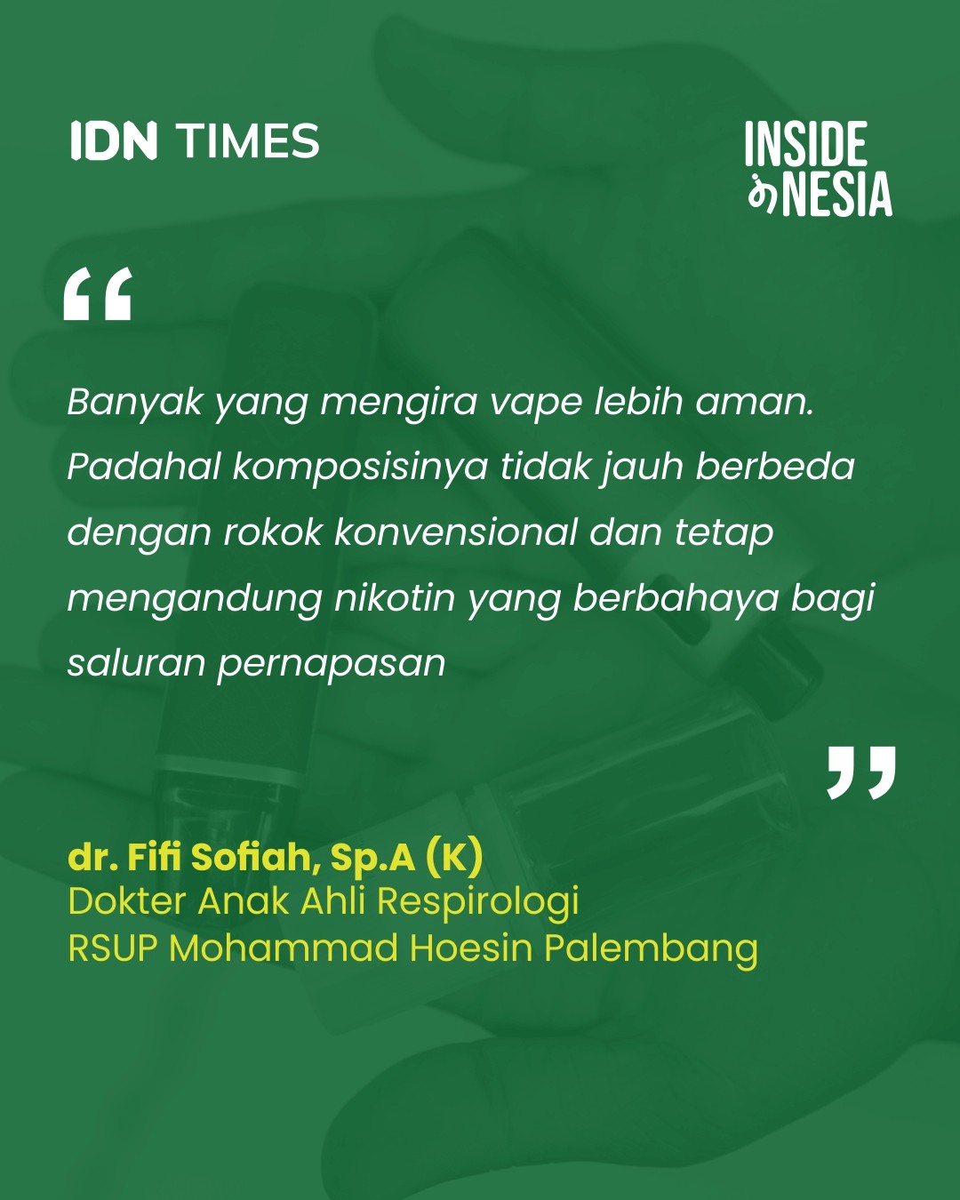 Dokter Anak Ahli Respirologi RSUP Mohammad Hoesin Palembang, Fifi Sofiah membeberkan tak banyak yang tahu dan sadar akan dampak asap vape pada anak. Menurutnya nikotin dalam rokok elektrik sangat berbahaya terhadap saluran pernapasan. Terutama pada mereka yang berisiko rentan terhadap gangguan saluran napas.